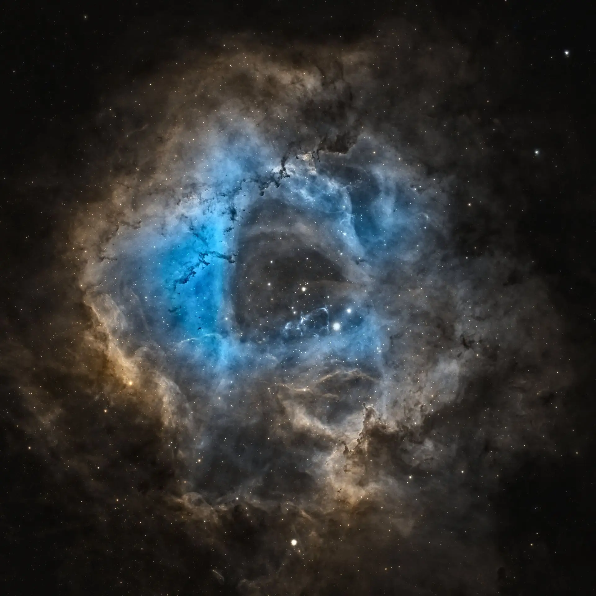 The Rho Ophiuchi Cloud Complex, located about 400-450 light-years away in the constellation Ophiuchus, is one of the closest star-forming regions to Earth. The complex's distinctive blue and yellow colors are due to the reflection of starlight by dust and ionized gas from nearby young, hot stars. It is a visually striking region with a unique arrangement of color in the night sky.